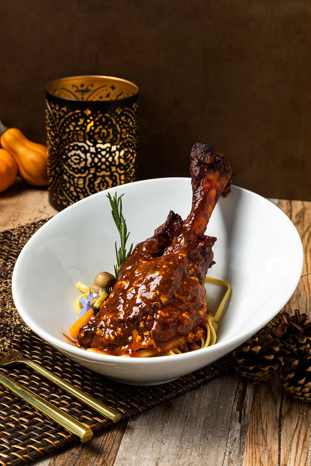 En un tazón grande o fuente, mezclar todos los ingredientes secos. Agregar las piernas de cordero y untar por todos los lados. Agregar 2 cucharadas de aceite de oliva, tomillo y romero. Cubrir bien y marinar en refrigerador por 45 min.